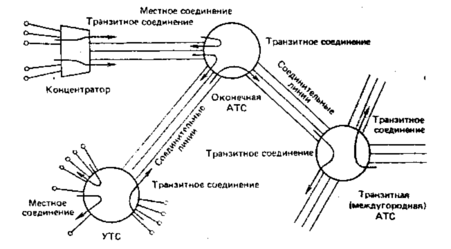 Транзитные соединения требуют установления соединительного пути от определенной входящей (вызывающей) линии к исходящей линии или группе исходящих (соединительных) линий. Обычно бывают доступны более одной исходящих линий. Например, при установлении соединения с группой межстанционных соединительных линий может использоваться любая в этой группе. Следовательно, структура системы при транзитной коммутации может быть упрощена, поскольку существуют альтернативы при выборе исходящей линии. Кроме того, даже нет необходимости в том, чтобы любая исходящая линия была доступна любой входящей. Функции транзитной коммутации должны быть реализованы на всех коммутационных системах телефонной сети. Некоторые системы, такие, как удаленные концентраторы и междугородные или транзитные коммутационные станции, обслуживают только транзитную нагрузку (в частности, не устанавливают местных соединений). Введенные выше понятия поясняет рис. 1.