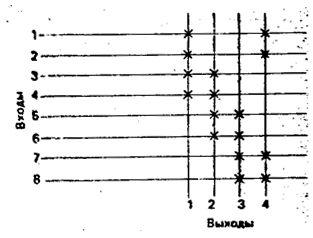 В большинстве перечисленных случаев требование обеспечения возможности установления соединения любого входа с любым выходом не является обязательным. Так, в случае, когда число выходов в группе достаточно велико, можно обеспечить каждому входу доступ не ко всем, а лишь к ограниченному числу выходов. В таких случаях говорят об "ограниченной доступности". Переход к схемам с ограниченной доступностью позволяет получить значительную экономию точек коммутации Для построения схем подключения группы выходов, доступных различным группам входов, разработан метод, который получил название "неполнодоступного включения". Пример схемы неполнодоступного включения приведен на рис. 3. Заметим, что, если соединение входов с выходами осуществляется продуманно, то отрицательный эффект ограниченной доступности минимизируется. Например, если требуется соединить входы 1 и 8 на схеме рис. 3 с группой выходов, то следует выбрать выходы 1 и 3, а не 1 и 4 с тем, чтобы избежать 6локировки входа 2.