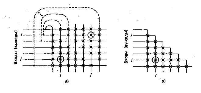 В треугольной коммутационной схеме на рис. 4 исключены все избыточные точки коммутации. Однако уменьшение числа точек коммутации не обходится без усложнений. До того, как установить соединение между входом i коммутационного устройства и входом j элемент управления коммутационного устройства должен определить, что больше по величине — i или j. Если окажется, что больше i, то выбирается точка коммутации (i,j). Если же окажется, что i меньше, то должна быть выбрана точка коммутации (j, i). При использовании ЭВМ для управления процессом коммутации сравнение номеров линий не представляет существенной добавки к общей загрузке машины. Однако в более старых системах с электромеханически управляемыми коммутационными устройствами дополнительно вносимое усложнение управляющего устройства оказывается весьма существенным.