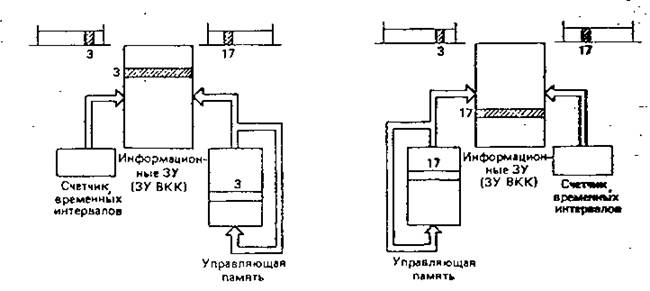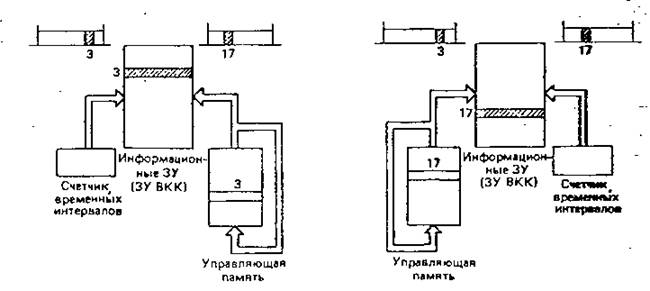 Можно указать два способа управления работой ЗУ звена временной коммутации: последовательная запись и произвольное считывание, или произвольная запись и последовательное считывание. На рис.9 показан принцип работы звена временной коммутаций для обоих способов управления с иллюстрацией способа доступа к памяти при передаче информации из временного канала 3 во временной канал 17. Заметим, что оба способа работы звена временной коммутации используют циклическую управляющую память, доступ к которой осуществляется синхронно с работой счетчика временных интервалов.
