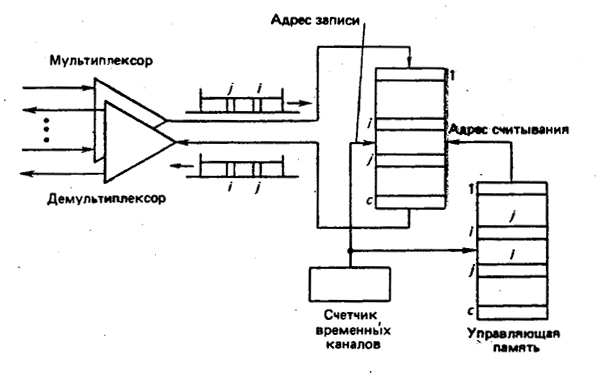 Принцип работы схемы коммутации на ЗУ поясняет рис.8. Как видно из рисунка, отдельные цепи, по которым идет передача цифровых сообщений, некоторым фиксированным образом объединяются так, что образуется один тракт с ВРК- Функции объединения и разделения можно рассматривать либо как функции самой схемы коммутации, либо как функции, реализуемые в удаленных терминалах. Если, функции объединения и разделения реализуются локально, то мультиплексор и де мультиплексор могут параллельно подключаться непосредственно к ЗУ. В противном случае используется преобразователь последовательного кода в параллельный, который позволяет предварительно накопить информацию определенного временного канала до того, как она будет записана в ЗУ. В любом случае для каждого входящего временного канала необходимо обеспечить доступ к каналу записи в ЗУ, и точно так же необходимо обеспечить доступ к каналу считывания для каждого исходящего временного канала. Обмен информацией между двумя различными временными каналами осуществляется с помощью ЗУ временной коммутации каналов (ВКК). В схеме ВКК, показанной на рис.8, информация, поступающая по входящим временным каналам, последовательно записывается в ячейки ЗУ. В то же время информация, поступающая в исходящие каналы, считывается из ЗУ ВКК по адресам, получаемым из блока управляющей памяти. Дуплексное соединение каналов i и j трактов с ВРК означает, что адрес i поступает в ЗУ ВКК в течение i-го временного интервала, и наоборот, как указывается в соответствующей управляющей памяти. Таким образом, в течение каждого временного интервала к ЗУ ВКК производятся два обращения. Первое, когда некоторое управляющее устройство (на рисунке не показано) выбирает номер временного канала, который определяет адрес записи в ЗУ. Второе, когда содержимое управляющей памяти, соответствующее определенному временному каналу, выбирается в качестве адреса считывания.