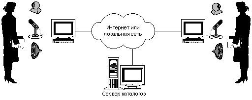 Самый простой способ состоит в использовании обычных мультимедиа-компьютеров, подключённых к Интернет (рис. 1.19). На обоих компьютерах требуется запустить специальную программу, например, Microsoft NetMeeting, которая на одном конце преобразует звук от микрофона в пакеты данных, а на другом конце преобразует эти пакеты обратно в звук и проигрывает его в динамик. Если один из компьютеров (или оба) оснащен видеокамерой, то можно передавать и изображение, показывая его на дисплее собеседника.