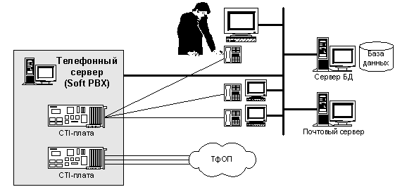 Особый класс телефонных приложений представляют собой программы, исполняющиеся на компьютере с CTI-платами, имитирующими поведение мини-АТС. К платам подключают не только внешние линии, но и внутренние телефоны, и всё это коммутируется под управлением приложения (рис. 1.31).
