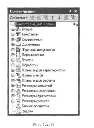 Показанное дерево конфигурации представляет собой иерархическую структуру всех объектов конфигурации. Сейчас все ветви свернуты и видны только виды объектов метаданных. При разворачивании каждой ветви можно увидеть набор объектов метаданных определенного вида, совокупность которых и образует конфигурацию.