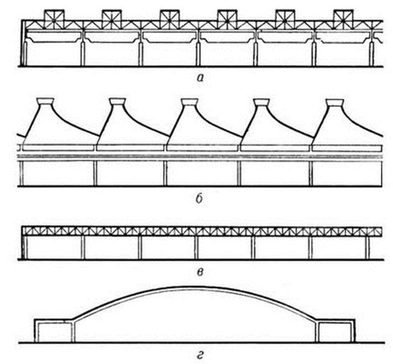 а – многопролетное крановое здание со световыми фонарями; б – многопролетное здание с аэрационными вытяжными шахтами ; в – многопролетное бескрановое бесфонарное здание; г – здание зального типа.