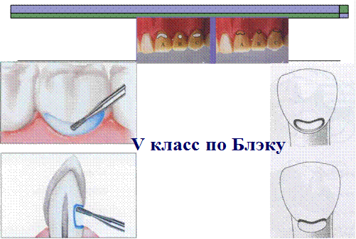 - оптимальной для полости V класса считается почкообразная форма с придесневой стенкой, параллельной десневому краю риса. Иногда, особенно в случаях, когда очаг поражения расположен на поверхности корня, полости придают овальную форму;