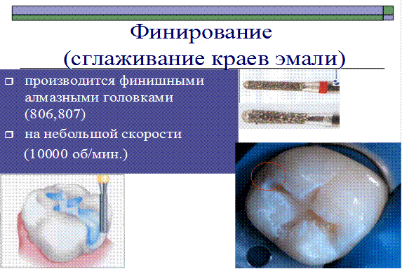 После обработки полости алмазными или твердосплавными борами на большой скорости эмаль по краям кариозной полости ослаблена, имеет трещины и неровности, что в дальнейшем может привести к нарушению краевого прилегания пломбы, появлению «белой линии» по краю реставрации. Для профилактики таких осложнений на заключительном этапе сглаживают (финируют) края полости при помощи финишных алмазных боров (с красной или желтой маркировкой), твердосплавных финиров, либо (что предпочтительнее) с использованием ультразвуковых насадок, например SONICflex. Эти инструменты имеют алмазное напыление только с одной стороны, что помогает избежать любого повреждения поверхности смежного зуба.