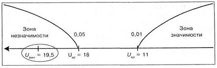 Величины критических значений уже найдены нами при расчете первым способом по таблице 7 Приложения, поэтому сразу строим «ось значимости», которая имеет следующий вид: