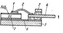 Наиболее широко распространенной схемой монтажа является соединение контакных площадок полупроводникового прибора, полученного по планарной технологии, с внешними выводами корпуса с помощью гибких проводников (рис.1). Один конец круглого проводника из алюминия или золота диаметром 10 -300 мкм должен быть приварен к тонкой металлической пленке тоже из алюминия или золота, напыленных на окисленный кремний. Другой конец – к золоченному или алюминированному ковару или к золоченной толстой пленке на керамическом основании корпуса. В некоторых случаях, когда полупроводниковые приборы выполняются без металлизации (например, мощные транзисторы), гибкие проводники необходимо присоединять непосредственно к поверхности кремния.