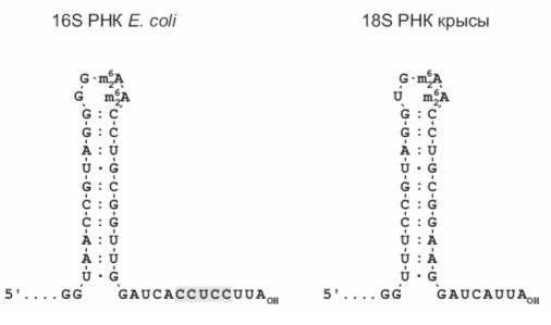 Концевые нуклеотидные последовательности прокариотической и эукариотической рибосомных РНК