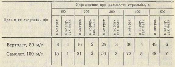 По парашютистам огонь ведется сопроводительным способом длинными очередями. При этом упреждение отсчитывается от середины фигуры цели по пути его снижения: на 100 м — 0,5 фигуры; на 200 м—1 фигура; на 300 м — 2 фигуры; на 400 м — 3 фигуры; на 500 м —4 фигуры.