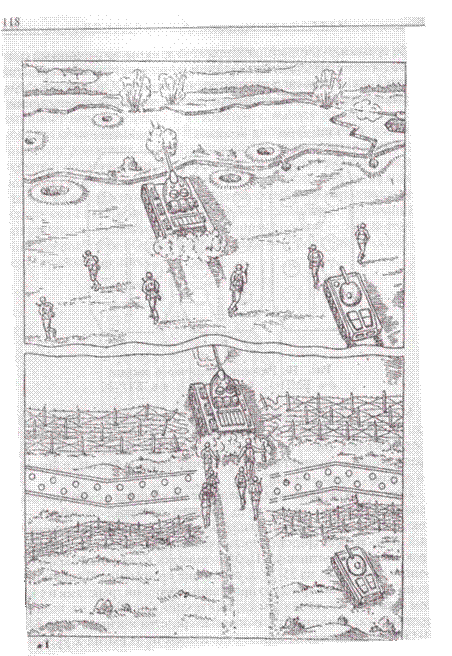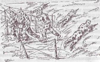 После преодоления минно-взрывных заграждений отделение вновь занимает свое место в боевой линии, стремительно врывается на передний край обороны противника и уничтожает его.