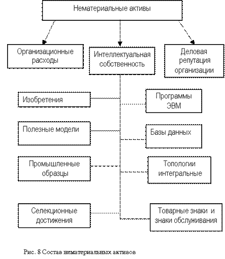 К нематериальным активам относятся объекты интеллектуальной собственности, деловая репутация организации (гудвилл), организационные расходы (рис. 8).