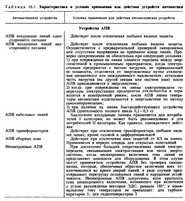 В настоящее время в системах электроснабжения промышленных предприятий применяют следующие виды автоматики: автоматическое повторное включение (АПВ); автоматическое включение резервного питания (АВР); автоматическое регулирование мощности компенсирующих устройств; автоматическая аварийная разгрузка по частоте (АЧР). Устройства автоматики выполняются на постоянном или переменном оперативном токе. На оперативном постоянном токе устройства автоматики в СЭС ПП применяют при наличии электромагнитных или пневматических приводов, на переменном – при наличии пружинных приводов. Сущность АПВ состоит в том, что элемент системы электроснабжения промышленного предприятия, отключенный в результате работы средств релейной защиты включается повторно. Опыт эксплуатации показывает, что достаточно большой процент повреждений имеет неустойчивый характер и после отключения напряжения самоустраняется. В числе таких повреждений перекрытия изоляции ВЛЭП в результате атмосферных перенапряжений, схлестывание проводов, неустойчивые перекрытия изоляции во вторичных цепях, неправильные действия оперативного персонала и т.д. Следует учитывать и тот факт, что стоимость устройств АПВ ничтожно мала по сравнению с убытками, приносимыми недоотпуском электроэнергии и простоем технологического оборудования. Устройствами АПВ, как правило, оснащаются воздушные (реже кабельные) линии, секции и системы шин, двигатели и одиночные трансформаторы, при этом в логике защиты стоит запрет на АПВ при работе газовой и дифференциальной защиты. Различают одно- и многократные АПВ, причем с увеличением кратности, эффективность их работы уменьшается (так для ВЛ 1 – 60-75%, а для 2 – 30-35%). Часто применяется ускорение действия защиты после АПВ.