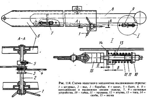 Основная выдвижная стрела.Выдвижение секции стрелы осуществляется канатным механизмом (рис 114) барабан 3 и штурвал 1, которого крепятся на валу 2 неподвижной секции 6 стрелы соответственно болтом 5 и шпонкой. Канат 4 крепится через натяжное устройство 7 в нижней части выдвижной секции 8, наматывается на барабан 3 (четыре витка) и вторым концом крепится через натяжное устройство 9 на верхней части, выдвижной секции 8. К тяге 13 он присоединяется с помощью вилки 15, а тяга связана со скобой 14 секции стрелы через пружину 11, которую затягивают гайкой 10.