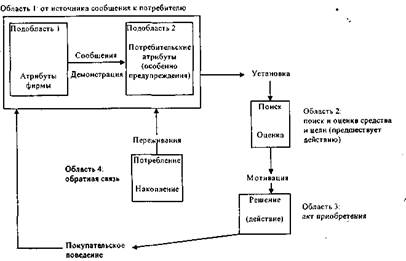 Первый блок делится на две части: элементы маркетинга фирмы, влияющие на установки потребителя, и психологические атрибуты (особенно предубеждения), влияющие на восприятие потребителем маркетинговых сообщений фирмы. Установка потребителя в отношении продукции фирмы является результатом действия этого блока.