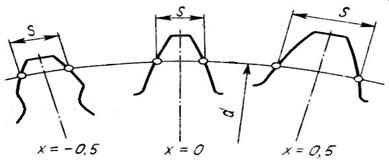Форма зубьев колес, нарезанных с различным смещением инструмента, показана на рис.5.6. Смещение изменяет форму зуба. Так, положительное смещение приводит к утолщению зуба у основания и уменьшению кривизны профиля. Такое изменение формы способствует повышению его прочности. Выбор того или иного смещения зависит от назначения зубчатой передачи, условий, в которых она работает, нагрузок на элементы зубчатой передачи и т.д.