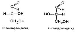 Все стереоизомеры (соединения, имеющие одну и ту же структурную формулу, но различающиеся по пространственной конфигурации, называются стереоизомерами) моносахаридов определяют по отношению к выбранному в качестве стандарта веществу – глицеральдегиду. Различают D- и L-формы (D- и L-конфигурации) по сходству расположения групп атомов у последнего центра асимметрии с расположением групп у D- и L-глицеральдегида. Общее число стереоизоизомеров для любого моносахараида выражается формулой N = 2n, где N – число стереоизомеров, а n – число асимметричных атомов углерода.