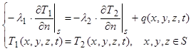 де q = q(x,y,z,t) – поверхнева густина джерел теплоти на границі S; T1,T2,l1, l2 – відповідно температури і теплопровідності дотичних середовищ..