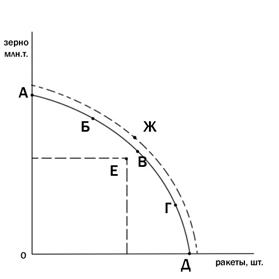 В данном случае точки А, Б, В, Г, Д - точки, принадлежащие КПВ. Точка Eвнутри графика КПВ означает неполное или нерациональное использование имеющихся ресурсов. Точка Ж (вне кривой) недостижима при данном количестве ресурсов и имеющейся технологии. Попасть в эту точку можно, если увеличить количество используемых ресурсов или улучшить технологию производства (например, сменить ручной труд на машинный). При движении по кривой возможен только один, лучший вариант движения, который дает максимальный результат при минимальных затратах. Кривая производственных возможностей показывает совокупность всех точек или решений, в пределах которых следует выбирать оптимальный вариант. Все остальные точки представляют собой упущенные возможности или альтернативные затраты.