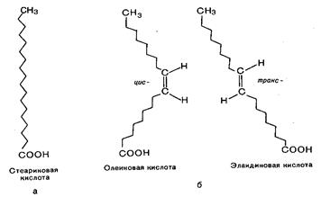 Природные ненасыщенные жирные кислоты имеют цис-конфигурацию и редко транс-конфигурацию (рис). Цис-изомеры имеют более низкую температуру плавлению. Цис-конфигурация делает насыщенную кислоту менее стабильной и более подверженной катаболизму.