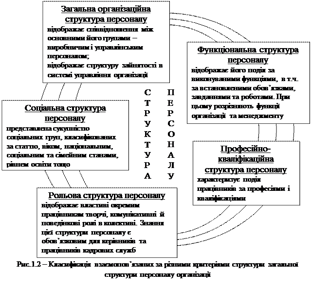 Персонал будь-якої виробничо-господарської організації є складною структурою, тобто сукупністю виокремлених за різними критеріями взаємопов’язаних структур: організаційної, функціональної, професійно-кваліфікаційної, рольової та соціальної. Сукупність цих взаємопов’язаних структур наведено схематично на рис.1.2.