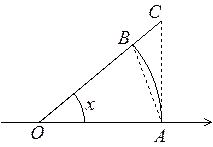 . Рассмотрим круг некоторого радиуса r, и пусть OA и OB – два радиуса этого круга, ограничивающие сектор S с центральным углом x ( рис.5.). Треугольник AOB содержится в секторе S, который, в свою очередь, содержится в прямоугольном треугольнике AOC; поэтому площадь DAOB не превышает площади S,