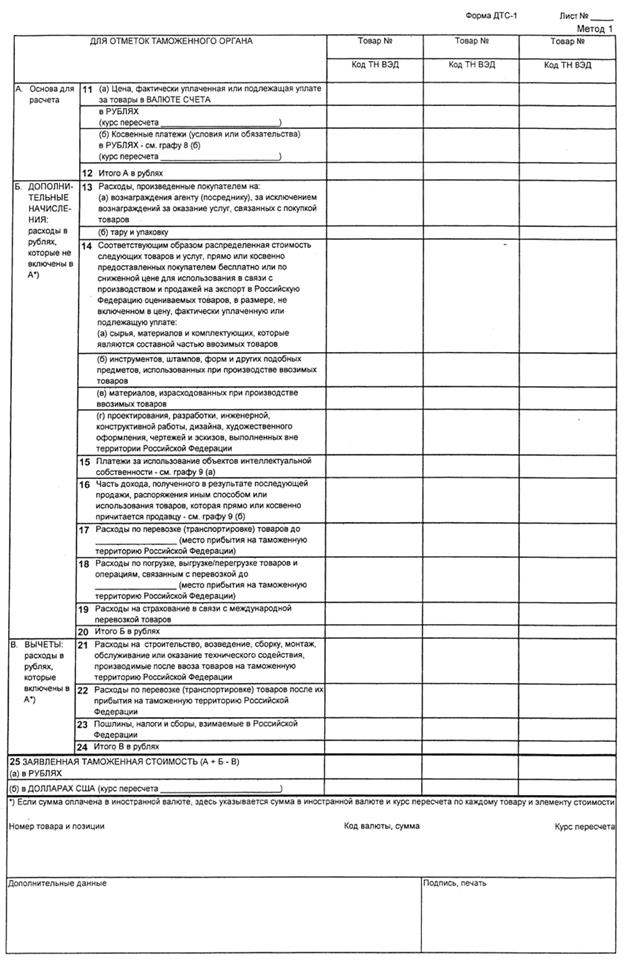 При определении таможенной стоимости товаров по стоимости сделки с ввозимыми товарами в соответствии со статьей 4 Соглашения (далее - метод 1) заполняется ДТС-1 (приложение № 2 к Порядку).