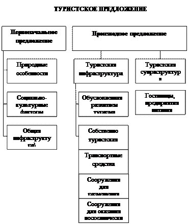 Туристское предложение состоит из первичного (первоначального) и производного предложений. Первичное предложение притягивает туристов своей естественной пользой. Оно создается не только для туристских целей. Производное предложение состоит из элементов, которые создаются исключительно для туристского использования. В составе производного предложения можно выделить туристскую инфраструктуру и туристскую супраструктуру.