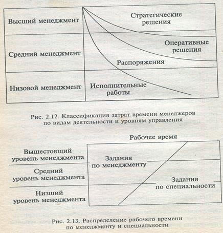 Следует отметить, что на всех уровнях управления руководители выполняют не только чисто управленческие, но и исполнительские функции. Однако с повышением уровня руководства удельный вес исполнительских функций понижается. Расчеты показывают, что на высшем уровне он занимает около 10%, на среднем — 50 и на низшем — около 70% общего времени менеджеров (рис. 2.12).