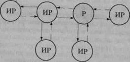 В звездной структуре коммуникаций (рис. 7.2, в) ярко выражен «коммутатор-руководитель», через которого передаются все задачи. Все связи замыкаются на нем (Р). Устойчивость и скорость передачи информации невысокие.