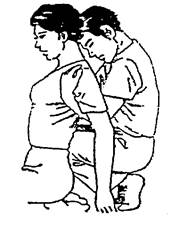 | Исходное положение пациента. Пациент садится на пятки с упором на колени, опускает руки и слегка отводит их назад. Исходное положение врача. Встаньте позади пациента на корочки с упором коленями в спину на уровне нижнегрудного отдела позвоночника, колени упираются по линии повздошных костей. Техника выполнения приема (Рис. 5а, 5в). Зафиксируйте туловище путем захвата "под мышками" за плечи и упора головой в затылок пациента. Произведите достаточно резкую тракцию верхней части туловища. Переместите колени выше и повторите тракцию. Проведите коррекцию на 5-6 уровнях позвоночника от поясничного до среднегрудного отдела. Следите, чтобы Ваша голова постоянно поддерживала затылок пациента, а его руки были свободно опущены и слегка отведены назад. Это необходимо для достижения эффекта релаксации, без чего коррекция не будет полной. Критерием эффективности приема является характерный звуковой эффект, свидетельствующий о коррекции суставных поверхностей межпозвонковых суставов позвоночника, туловища. |