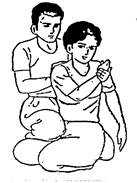 | Зафиксируйте голенью правой ноги правое бедро пациента. Положите левую руку на правую кисть пациента со стороны подмышечной впадины. Правой рукой упритесь в область правого плеча пациента со стороны его спины. Выполните первый этап. Медленно разверните туловище пациента так, чтобы его тело повернулось против часовой стрелки. Поворот выполняйте до возникновения сопротивления. Выполните второй этап. Произведите резким, но коротким движением дополнительную ротацию туловища против часовой стрелки. |