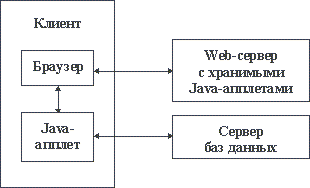 Даже начальное введение в Intranet было бы неполным, если не упомянуть про возможности языка Java. Java - это интерпретируемый объектно-ориентированный язык программирования, созданный на основе языка Си++ с удалением из него таких "опасных" средств как адресная арифметика. Мобильные коды (апплеты), полученные в результате компиляции Java-программы, могут быть привязаны в HTML-документу. В этом случае они поступают на сторону клиента вместе с документом и выполняются либо автоматически, либо по явному указанию. Апплет может быть, в частности, специализирован как шлюз к серверу баз данных (или к какому-либо другому серверу). При применении подобной техники доступа к базам данных схема организации Intranet-системы становится такой как на рисунке 4.9.