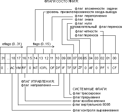 eflags/flags (flag register) — регистр флагов. Разрядность eflags/flags — 32/16 бит. Отдельные биты данного регистра имеют определенное функциональное назначение и называются флагами. Младшая часть этого регистра полностью аналогична регистру flags для i8086. На рис. 2 показано содержимое регистра eflags.
