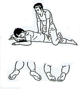 Исходное положение пациента - лежа на животе. Руки согнуты в локтевых суставах на уровне головы. Ноги - разведены, стопы ротированы внутрь. Поверните голову пациента влево.