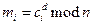 Для шифрования сообщения m оно сначала разбивается на цифровые блоки, меньшие n(для двоичных данных выбирается самая большая степень числа 2, меньшая n). То есть, если pи q – 100-разрядные простые числа, то nбудет содержать около 200 разрядов, и каждый блок сообщения mi должен быть около 200 разрядов в длину. (Если нужно зашифровать фиксированное число блоков, их можно дополнить несколькими нулями слева, чтобы гарантировать, что блоки всегда будут меньше n. Зашифрованное сообщение c будет состоять из блоков ci той же самой длины. Формула шифрования выглядит так