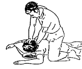 Исходное положение врача. Займите исходное положение "верхом" с упором на колени в области поясницы пациента. Левую ладонь положите на область седьмого шейного позвонка и зафиксируйте ею спину пациента, прижав весом своего тела. Правую ладонь положите на левую височно-теменную область головы пациента, не накрывая при этом ушную раковину.