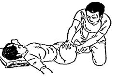 Исходное положение врача. Займите исходное положение с упором на колени так, чтобы левое колено пациента находилось между Ваших ног или опиралось на Ваше левое бедро. Положите большие пальцы обеих рук на паховую область левого бедра пациента. Ладонями обхватите бедро. Большие пальцы должны соприкасаться друг с другом.