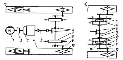 а) с фрикционным механизмом поворота; б) с планетарным;1 – двигатель; 2 – фрикционная дисковая муфта сцепления; 3 – коробка передач; 4 – гусеницы; 5 – соединительные валы; 6 – главная передача; 7 – многодисковые фрикционные муфты (бортовые фрикционы); 8 – ленточный тормоз; 9 – бортовые редукторы; 10 – ведущие звездочки; 11 – вал; 12 – солнечные шестерни; 13 – тормоза; 14 - водила
