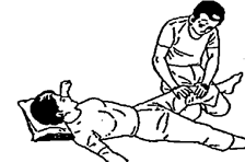 Исходное положение врача. Займите исходное положение с упором на колени так, чтобы левое колено пациента находилось между Ваших ног. Ладонями обхватите верхнюю часть бедра. Большой палец правой руки необходимо положить на большой палец левой руки.
