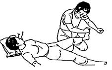 | Исходное положение врача. Займите исходное положение, сидя на пятках с упором на колени слева от пациента таким образом, чтобы левая стопа пациента лежала на Вашем правом бедре. Правой рукой захватите левую стопу пациента с тыльной стороны на уровне пальцев. Техника выполнения приема (рис.57а,57в). Ногу пациента держите на весу. Произведите пятикратное ударное воздействие ладонной поверхностью левой руки, собранной в кулак, по подошвенной поверхности левой ноги пациента на уровне максимальной выраженности продольного свода стопы. |