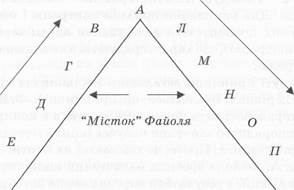 Приклад. Припустимо, потрібно передати повідомлення від індивіда Д до індивіда О, які знаходяться на одному рівні ієрархії, але в різних підрозділах. Відповідно до вказаної ієрар-хічної структури формальний контакт між ними може бути здійснений тільки через ступені ієрархії влади (вгору і вниз). Проте очевидно, що розумніше і набагато швидше для Д і О здійснити прямий контакт, минувши шість керівників вищого рівня. Файоль стверджував, що в будь-якій організації варто дозволяти такий прямий горизонтальний зв'язок, принаймні в кризових ситуаціях, коли важлива швидкість дії. Цей соціальний комунікаційний канал отримав назву "місток" Файоля.