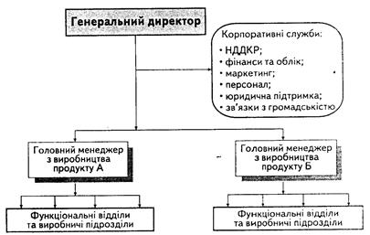 Дивізіонально–продуктова структура надає можливість збільшувати асортимент продукції, яку виробляє та реалізує підприємство (рис. 5.12).