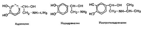 Гормоны мозгового слоя надпочечников. В надпочечниках синтезируются два главных гормона: адреналин и норадреналин, а также гормон изопропиладреналин. Адреналин и норадреналин являются производными двухатомного фенола пирокатехина, поэтому они называются катехоламинами.