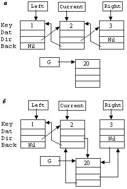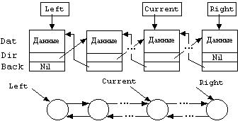 Тип TNodeDList - это самоадресующийся тип. Он предусматривает наличие в элементе двухсвязного списка двух структурных указателей: поле Dir предназначено для размещения указателя на следующий правый элемент, поле Back - на следующий элемент, расположенный в логической структуре слева. Поле Key введено с целью облегчения дальнейших пояснений.