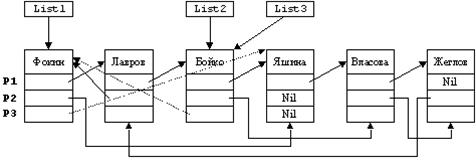 Указателем Р3-списка является внешний указатель List3. Этот пример показывает, что необязательно, чтобы каждый элемент общей списковой структуры непременно входил во все цепные списки одновременно.
