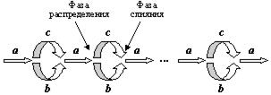 Допустим, исходная последовательность хранится на ленте а. Кроме того, используются r дополнительных лент: b1, b2 , …, br. Тогда r-путевое слияние выполняется следующим образом: первая серия на ленте а распределяется на ленту b1, вторая - на ленту b2 и т. д., r-ая серия - на ленту br; затем (r+1)-ая серия на ленту b1, (r+2)-ая - на ленту b2 и так до тех пор, пока не распределится последняя из серий ленты а. Затем начальные серии всех дополнительных лент, сливаются на ленту а в одну общую серию, вторые серии дополнительных лент сливаются во вторую серию на ленту а и т. д. Подобный процесс может быть представлен схемой, показанной на рисунке 11.8.