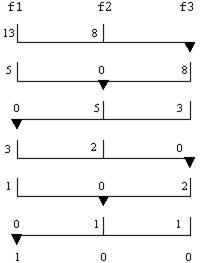 Продемонстрируем многофазную сортировку на примере с тремя последовательностями (лентами) f1, f2 и f3. В каждый момент сливаются элементы из двух лент-источников и записываются в третью ленту. Как только одна из входных последовательностей исчерпывается, она сразу же становится выходной для операции слияния из оставшейся, неисчерпанной входной последовательности и предыдущей выходной.
