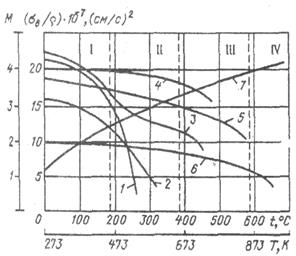 Такими областями применения материалов будут: I - для алюминиевых сплавов; II - для легированных сталей и титановых сплавов; III - для коррозионностойких сталей; IV - для жаропрочных сплавов. Из сравнения свойств (прочности, длительной прочности, выносливости и ползучести при повышенных температурах) титановых сплавов на основе алюминия, титана, никеля, ниобия следует, что алюминиевые сплавы целесообразно применять при температурах до 150 0С, титановые - до 480 0С, различные никельхромовые - до 870 0С, ниобиевые сплавы с соответствующим защитным покрытием пригодны для работы при высоких температурах до 1300 0С.